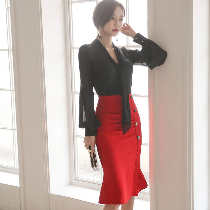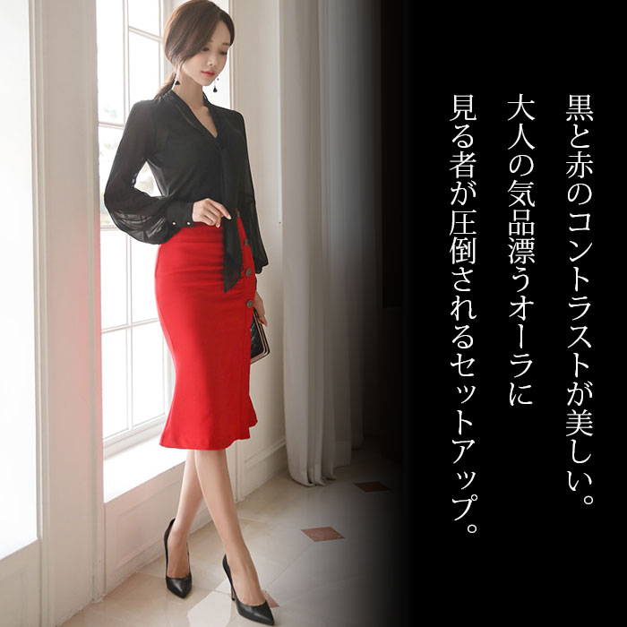 商品番号 ks7-3508 サイズ(cm)※B/W/Hは推奨サイズ ■Sトップ着丈:53 / 袖丈:60 / 肩幅:42 / B:78-84 / W:60-66ボトム着丈:68 / W:58-62 / H:80-84■Mトップ着丈:54 / 袖丈:61 / 肩幅:43 / B:82-88 / W:64-70ボトム着丈:69 / W:62-66 / H:84-88■Lトップ着丈:55 / 袖丈:62 / 肩幅:44 / B:86-92 / W:68-74ボトム着丈:70 / W:66-70 / H:88-92■LL(XL)トップ着丈:56 / 袖丈:63 / 肩幅:45 / B:90-96 / W:72-78ボトム着丈:71 / W:70-74 / H:92-96 カラー ブラック×レッド 素材 / 伸縮性 ポリエステル / 伸縮性なし / トップス透け感あり モデル身長 166cm/S着 詳細 黒と赤のコントラストが非常にきれいで優美に映える、ミディアム膝丈のセットアップアンサンブルです。