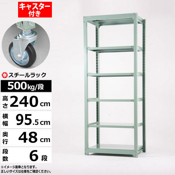 スペック 耐荷重 500kg/段(1段につき) サイズ 高さ240cm×横幅95cm×奥行48cm - 6段 カラー ホワイトグレー色(RoHS適合)およびライトグリーン色素材スチール(鉄)その他■製品資料PDF 商品関連ワード:スチールラック ラック 棚 移動棚 移動ラック キャスターラック 可動式ラック 可動棚 書籍棚 書棚 本棚 オープン棚 スチールシェルフ バックヤード 車庫 物流 [W90] [D45] [H240]※単位はmm(ミリ) ※段間隔は標準配置の場合です ※段位置は50mmピッチで上下に変更可能です サイズ 高さ240cm×横幅95cm×奥行48cm - 6段 実寸(外寸) 高さ240cm×横幅95.5cm×奥行48cm 有効寸(内寸) 横幅84cm×奥行44cm 形式 単体 段数 6段 耐荷重 500kg/段※キャスター総耐荷重は480kgとなります 重量(自重) 82.32kg オプション品 増段用棚板セット(棚板1枚+棚受け2本) 材質 スチール 色塗装 ホワイトグレー色(RoHS適合)およびライトグリーン色