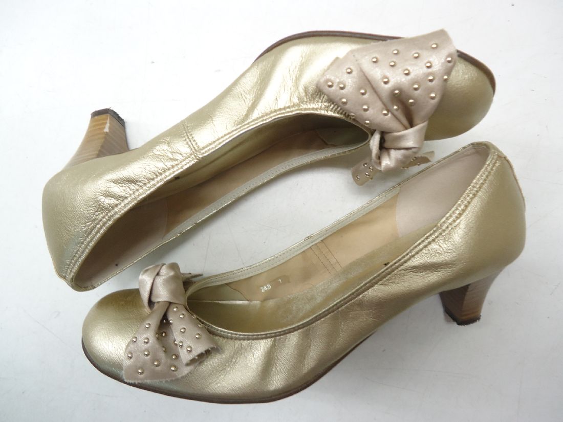 recolte/レコルト■24.5cm■レザー リボン スタッズ パンプス■GOLD/ゴールド/金色■高品質の日本製☆【中古】
